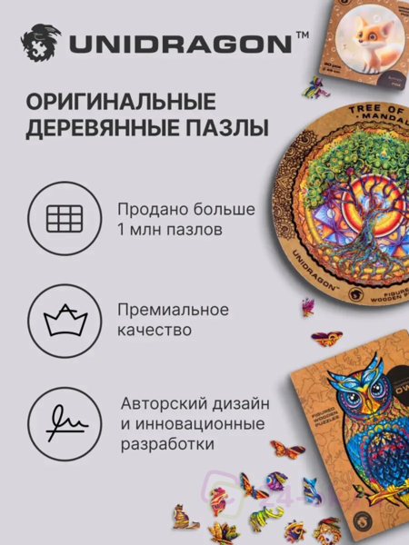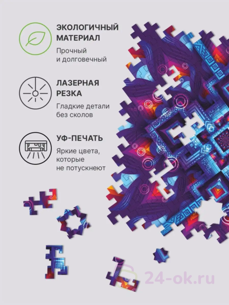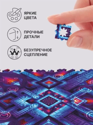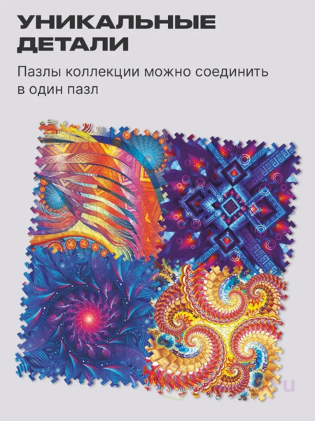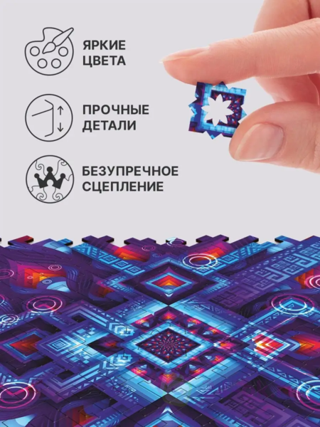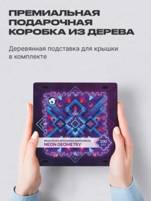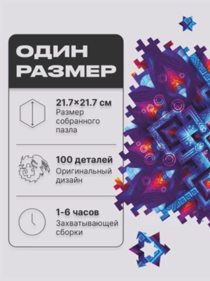 Неоновое свечение этого геометрического узора намекает на его математическую природу. Кажется, что стоит лишь найти нужную формулу, и "Неоновая Геометрия" оживет, открывая портал в идеально размеренный мир чисел. Геометрические детали пазла сплетаются в замысловатый лабиринт, в центре которого хранится драгоценный камень знания. Сможете ли вы найти ключ к этой загадке?Серия деревянных пазлов "Абстракции" из коллекции Unidragon Mind-Breaker исследует бесконечные фракталы, спирали, переплетения линий и новые измерения. Погрузитесь в них с головой и ощутите, как время замирает, пока вы решаете эти геометрические головоломки. Каждая из них — настоящее испытание из 100 деталей, пройдя которое вы ощутите неподдельное удовлетворение.В серии 4 пазла, которые можно объединить в одно большое полотно или собирать вместе! Неровные края головоломки выступают не только украшением, но и зацепкой для других пазлов серии.