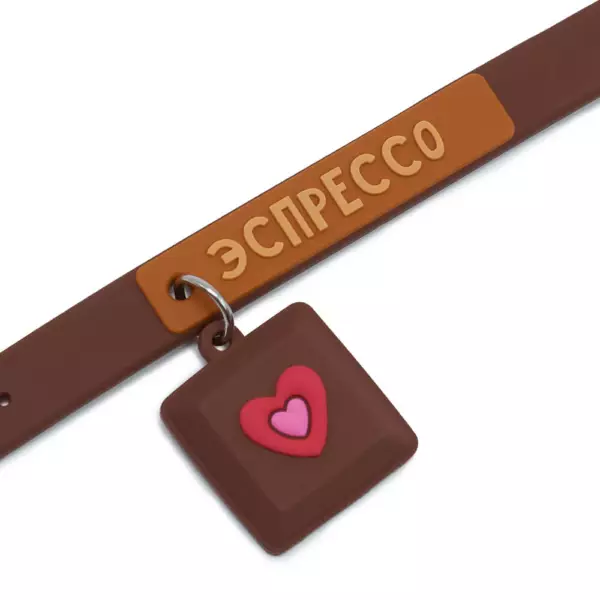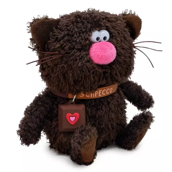 Милый котёнок Эспрессо из тактильно приятного эко меха цвета горького шоколада. Лапки и хвостик из более короткого меха. Усики из шелковистого крученого шнура. Объемный носик обтянут розовым софтом. Глазки из пластика. На пяточках и внутри ушек вшит темно‑коричневый софт. На шейке у котёнка силиконовый чокер с названием и небольшим подвесом в виде шоколадной «Валентинки». Чокер легко снимается и может послужить в качестве модного браслета для хозяина.