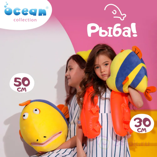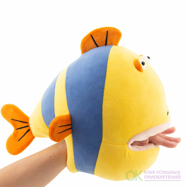 Рыбка моя! Так говорят не только любимым женщинам, хотя и им тоже. Так можно сказать и нашей Рыбе. Она знаете какая? Большая, круглая, яркая и оооочень мягкая. Настолько, что приложившись к ней щекой, Вы поймёте что означает слово Мягкость. Она имеет слегка глупый вид (как и многие очень красивые люди), особенно, когда из её рта торчит Ваша рука... Ой, забыли сказать, что у неё есть потайной кармашек, куда можно засовывать руки и устраивать весёлые представления.