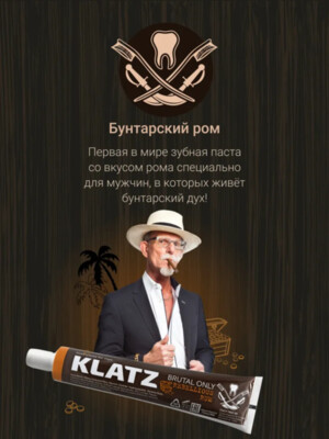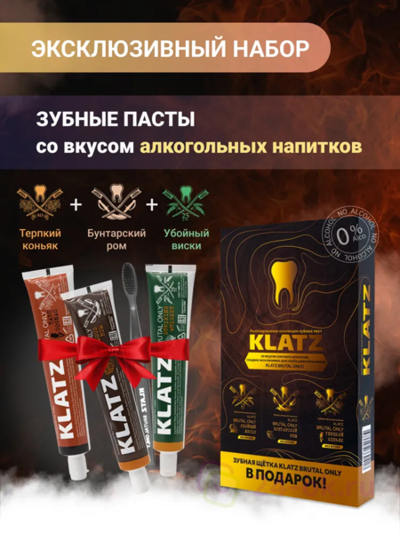 Первый эксклюзивный подарочный набор мужских зубных паст со вкусом элитного алкоголя. В наборе вас ждут уникальные зубные пасты с терпким вкусом коньяка, элитного виски и рома для мужчин, которые знают вкус настоящей жизни! Эксклюзивно для клуба джентльменов Klatz Brutal Оnly.