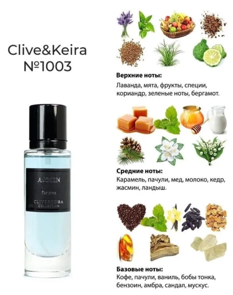 Clive & Keira 1003 A'men обладает древесным ароматом с вкраплениями душистых амбровых нот, таящих в себе воспоминания о легендарных историях и великих свершениях прошлого. Аромат воплощает в себе образ героя, смелого и великодушного, ведущего за собой вперед, к славным победам и грандиозным свершениям. Для таких мужчин не существует преград и недостижимых целей, потому что они молоды, сильны, полны задора и страсти. Парфюмерная композиция состоит из нот свежей мяты, жаркого кофе, нежной карамели и прохладной, сочной лаванды.