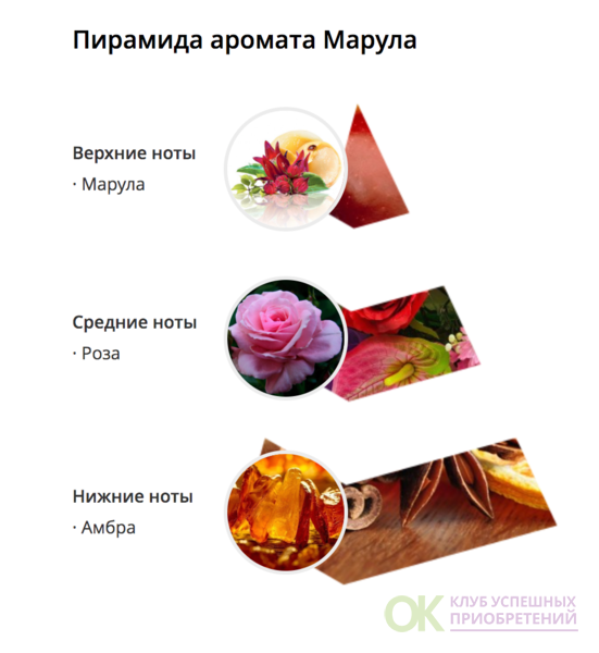 Насыщенный аромат марулы и королевской розы с нотами бергамота, ягод перечного дерева, лилии и фрезии.