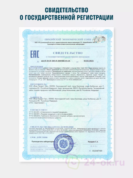 Торговое наименование: Биологически активная добавка к пище «Хлорофилл»/«Chlorophyll» со вкусом- Мята / taste- Mint.
