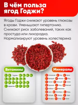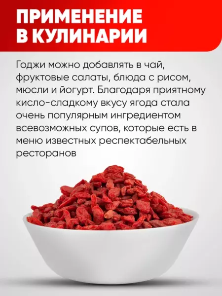 Сушёные ягоды годжи – уникальный продукт, обладающий приятным сладко-солёным вкусом. Природный антиоксидант, который защищает организм от действия свободных радикалов, продлевая молодость. Ягоды годжи называют «плодом долголетия». Являются источником 18-ти аминокислот, 8 из которых – незаменимы. Богаты витаминами В и С, а также минералами: кальцием и железом. Регулярное употребление в пищу ягод годжи способствует нормализации уровня холестерина. Продукт может помочь тем, кто мечтает о стройной фигуре. Годжи получили распространение в китайской медицине, где они применяются для очищения организма от токсинов и улучшения зрения. Не содержит ГМО и глютен. Срок годности: 12 месяцев Хранить при температуре не выше +25 °С и относительной влажности не более 75% в проветриваемых помещениях при отсутствии прямых солнечных лучей.