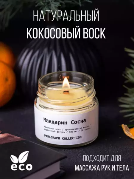 Свеча состоит из 100% натурального кокосового воска, ароматов с маслами, деревянного фитиля. Благодаря натуральным компонентам свеча безопасна и не выделяет вредных веществ. Эта ароматическая свеча идеально подойдет для создания приятной атмосферы перед сном, во время завтрака, романтического и семейного ужина, занятия йогой.