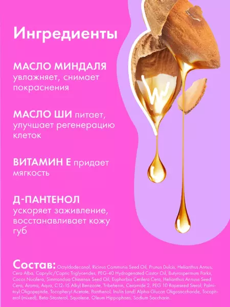 Активные ухаживающие компоненты: витамин Е, пантенол и церамиды, миндальное и кокосовое масла, а также ши (карите), проникают в глубокие слои сухой кожи. Восстанавливающий и смягчающий эффект, как от масла-бальзама обеспечен. Нежная масляная текстура избавит от дискомфорта и неприятных ощущений. Прекрасная альтернатива продуктам из Кореи, заживляющим корейским бальзамам. Парфюмированная губнушка с ароматом малины, шампанского и клубники может стать удачным дополнением к любому подарку, на любой праздник. Сладкий ягодный запах понравится и взрослой женщине и подростку. Она прозрачная, поэтому ее можно использовать как детскую губнушку в категории 5+ и подростковую. Замечательно подойдет ребенку, девочке от 5 лет. Это косметика для всех и должна быть в косметичке любой девушки.