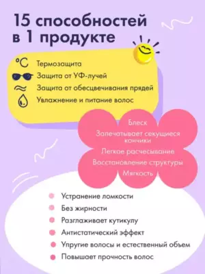 Такой защитный, восстанавливающий продукт 15в1 для разглаживания, питания и увлажнения не уступает корейским товарам и станет незаменимым профессиональным помощником по уходу в домашних условиях. После применения смягчающей солнцезащитной уходовой косметики локоны будут как после комплексных салонных процедур.