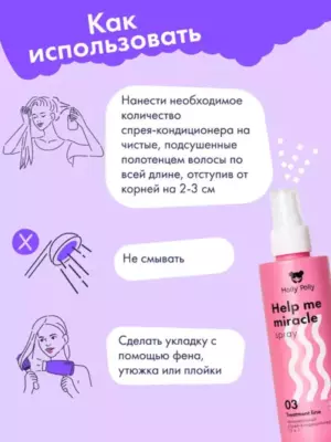 Несмываемый спрей-кондиционер Help me miracle 15 в 1 Holly Polly — многофункциональное средство, которое идеально подходит для смягченгия и термозащиты всех типов волос. В его ухаживающей основе увлажняющий протеиновый комплекс, который удерживает влагу и придает прическе эластичность, гладкость и блеск. Питательная маска-спрей обладает насыщенной текстурой, быстро впитывается, не оставляя при этом чувства липкости. Благодаря удобному мелкому распылителю легко распределяется и экономично расходуется. Локоны приобретают здоровый, ухоженный вид уже после первого использования.