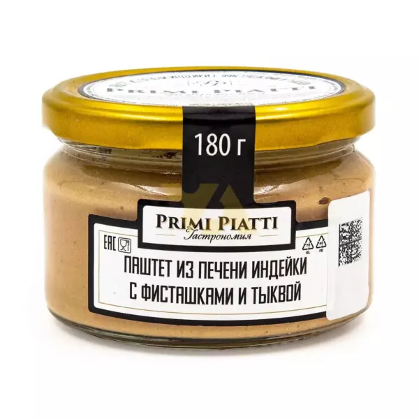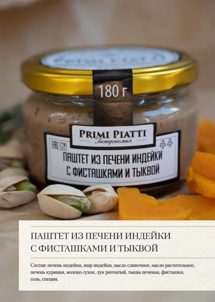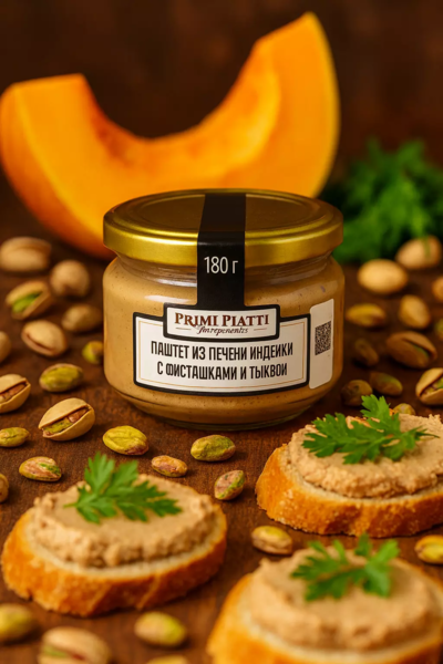 Нежная печень индейки, отобранная за свою мягкость, медленно тушится с оливковым маслом, свежими травами и кусочками тыквы, которые придают паштету нежный золотистый оттенок и лёгкую карамельную ноту. Фисташки добавляют изысканный хруст и бархатистый ореховый акцент — как маленькое гастрономическое приключение в каждом кусочке.