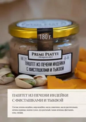 Состав: печень индейки, жир индейки, масло сливочное, масло растительное, печень куриная, молоко сухое, лук репчатый, тыква печеная, фисташки, соль, специи.