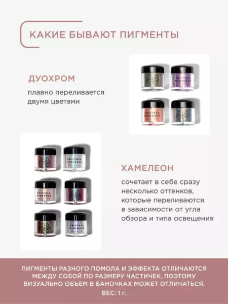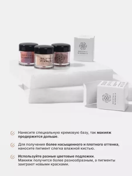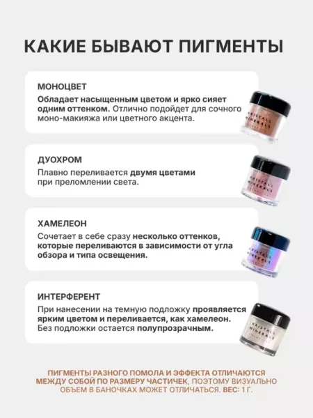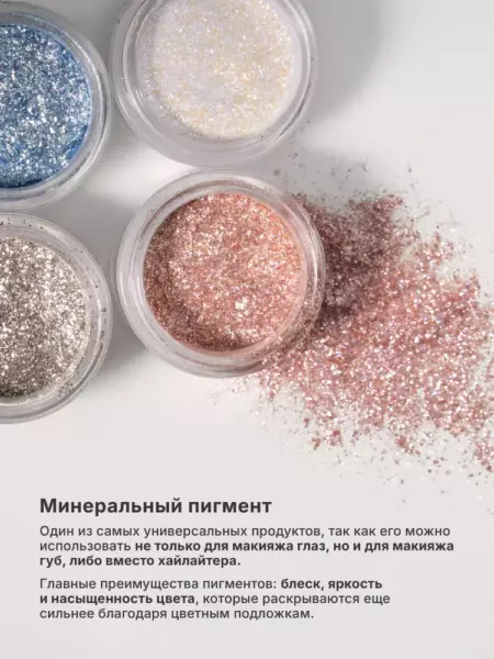 Минеральный пигмент — один из самых универсальных продуктов, так как его можно использовать не только для макияжа глаз, но и для макияжа губ, либо вместо хайлайтера. Главными преимуществами пигментов считаются блеск, яркость и насыщенность цвета, которые раскрываются еще сильнее благодаря цветным подложкам.