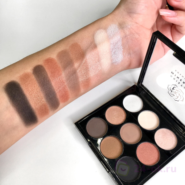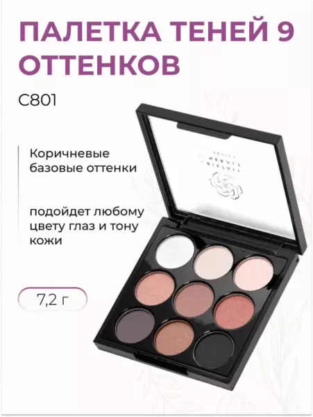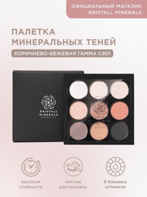 Создайте неповторимый образ с помощью одной из четырех палеток теней от KRISTALL MINERALS cosmetics. Великолепное сочетание текстур матового и шиммерного финиша гармонирует с цветовой палитрой оттенков - от самого светлого к темному. Такое разнообразие обеспечит бесконечный простор для создания потрясающих образов: от дневного, базового макияжа до яркого и вечернего! Миксуйте теплые и холодные оттенки, делайте полностью матовый или сверкающий мэйк, создавайте свои необычные эффекты или шикарный моно-макияж. Придайте своим глазам эффектность и невероятную выразительность с помощью палетки KRISTALL MINERALS. Каждая из четырех палеток теней – это универсальное сочетание оттенков и текстур, собранные воедино для создания идеального макияжа глаз! Нежная и шелковистая текстура теней превосходно переносится на кожу век и легко растушевывается, а высокая пигментация в сочетании с ультра-мелким помолом обеспечит плотное сцепление с Вашей кожей и продлит стойкость макияжа в течении всего дня. Для нанесения используйте синтетическую или натуральную кисть удобного для Вас размера. Легкими, промакивающими движениями наберите тени на кисть и похлопывающими движениями наносите тени на веко. Для достижения более насыщенного цвета и плотного покрытия – тени можно наслаивать или наносить влажным способом. Палетка С801 – коричневые оттенки базовых цветов с небольшой изюминкой. В палетку вошли: шиммерные тени С201 «Снежная королева», матовые С104 «Топленое молоко», шиммерные С209 «Розовое золото», шиммерные С217 «Ореховое пралине», матовые С106 «Молочный шоколад», шиммерные С214 «Медный закат», матовые С108 «Серый кварц», шиммерные С221 «Лесной орех», матовые С102 «Графит».