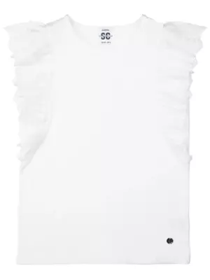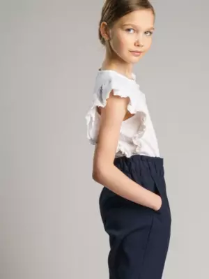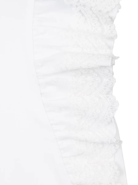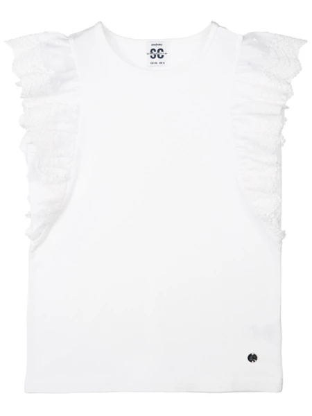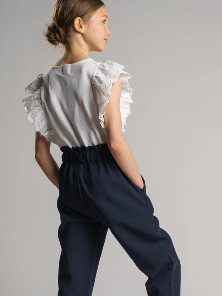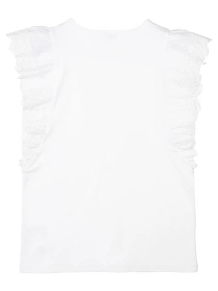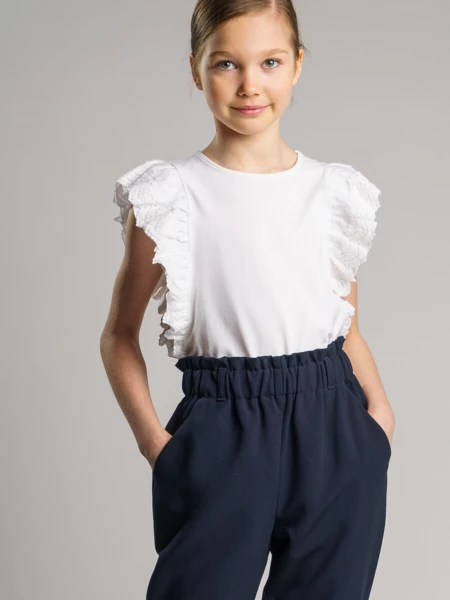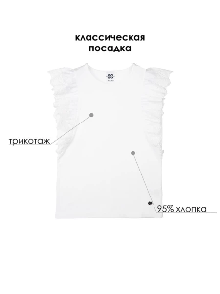 Белая нарядная трикотажная блузка прямого силуэта для девочки подростка - прекрасная альтернатива текстильной блузке или рубашке. Школьная блузка очень мягкая и приятная на ощупь, блузка хорошо держит форму, проста в эксплуатации и уходе. Высокое содержание хлопка 95%. Благодаря наличию эластана в составе ткани изделие проще в уходе и держит форму. Рубашка в школу с рукавами-"крылышками" из кружева разнообразит повседневные школьные образы.