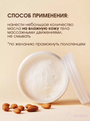 Способ применения: нанести на влажную кожу тела, легко массируя, по желанию промокнуть полотенцем. Расход взбитого масла минимальный – одна чайная ложка на всё тело.