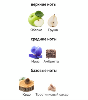 Ноты: ирис, коричневый сахар, амбретта, кедр, груша, яблоко