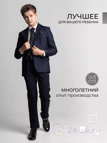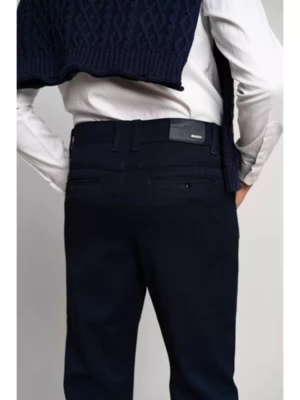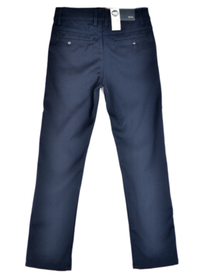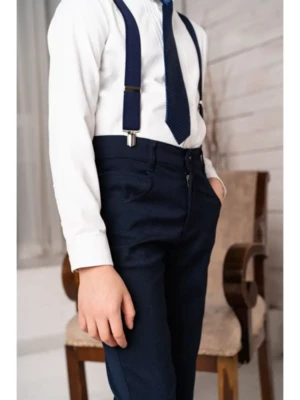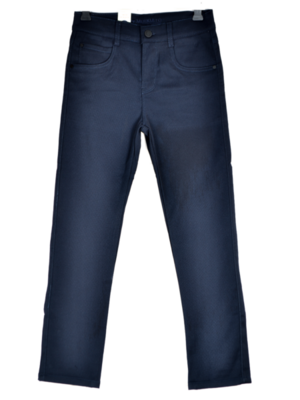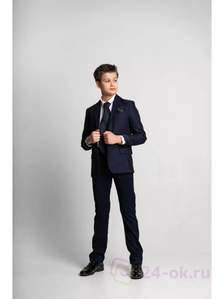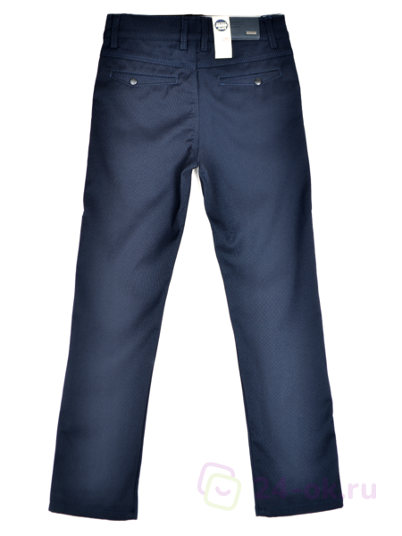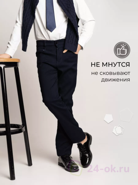 Узко прямая модель брюк из мягкого материала темно-синего цвета. Есть утяжка в поясе.