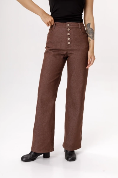 Детали: брюки с высокой посадкой, прилегающий силуэт, притачной пояс со шлевками, застежка на пуговицы, перед с боковыми карманами, спинка с кокеткой и двумя накладными карманами.