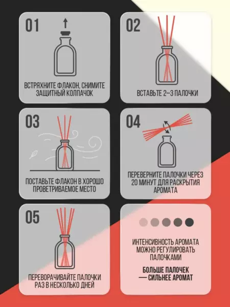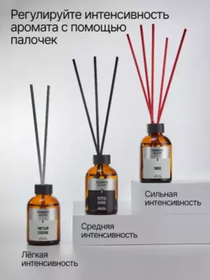 В комплекте приложены фибровые палочки, по 5 шт, которые равномерно распределяют аромат по комнате. Насыщенностью аромата можно управлять меняя количество палочек в бутылке.