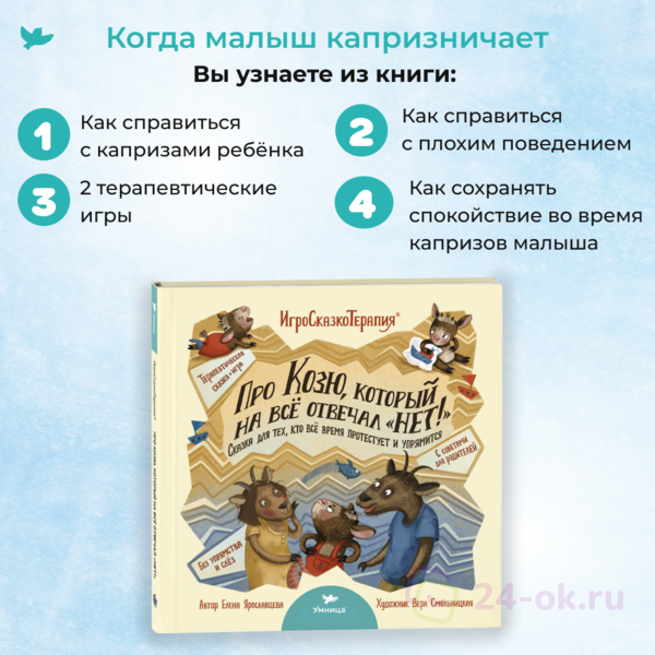 Герой сказки - маленький козлёнок Козя. Он обожает пиратов и бодаться. А вот когда родители командуют, он не любит и сразу же отвечает на всё: «Нет!» Ведь он уже большой. Он всё знает и умеет сам! Книга рассказывает, как родители Кози смогли договориться со своим малышом, и учит других родителей справляться с детским упрямством.