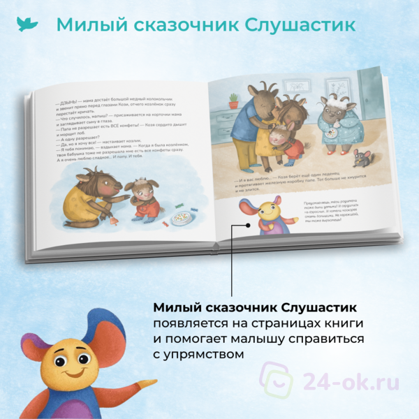 А ещё в книге есть очаровательный рассказчик Слушастик. Своим большим ухом он готов выслушать всё, что беспокоит малыша. Благодаря Слушастику ребёнок учится делиться своими переживаниями и “прорабатывает” свои эмоции.