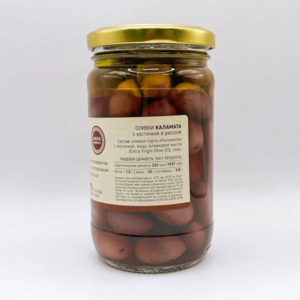 Оливки сорта "Каламата" с косточкой, оливковое масло, вода, соль, специи.