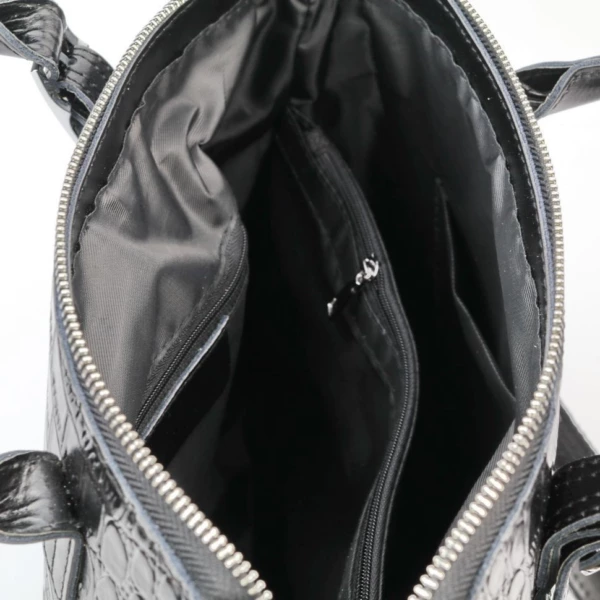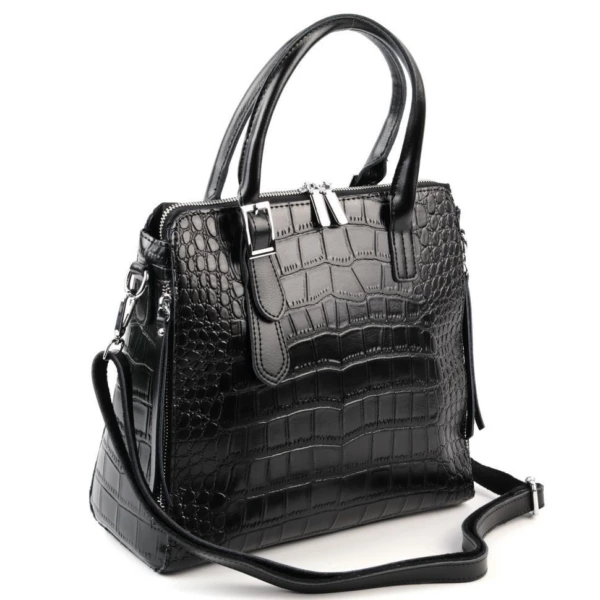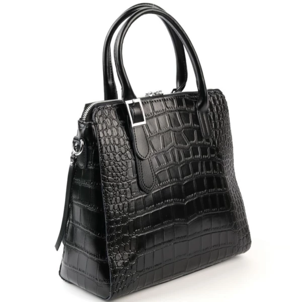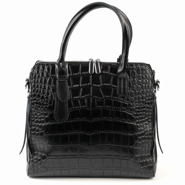 Женская сумка из натуральной кожи под крокодила черного цвета. Высота ручек 13 см. Снаружи, по бокам-карманы на молнии. Сумка закрывается на молнию. Внутри отделение, разделенное карманом на молнии по середине и боковые кармашки, один на молнии и один открытый. На дне сумки металлические ножки. В комплекте, съемный регулируемый по длине наплечный ремень, с максимальной длиной 140 см.