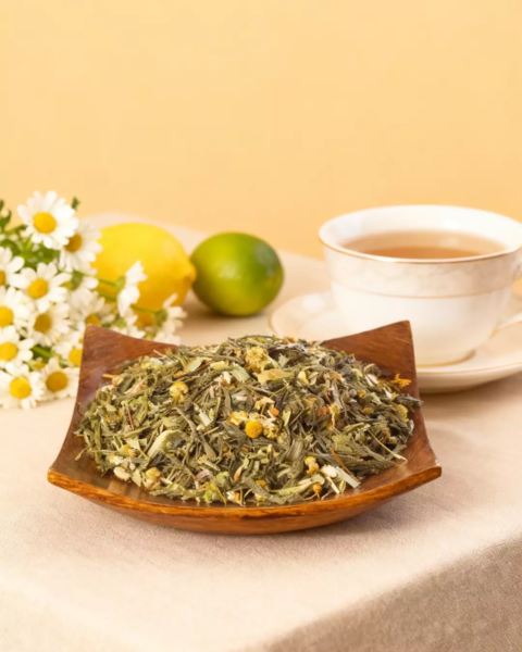 Состав: Китайский зеленый чай сенча, лимонная трава, листья липы, цедра лимона, цветки ромашки, вербена. С добавлением натурального ароматизатора лимона и липы.