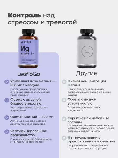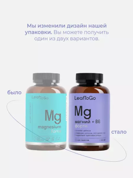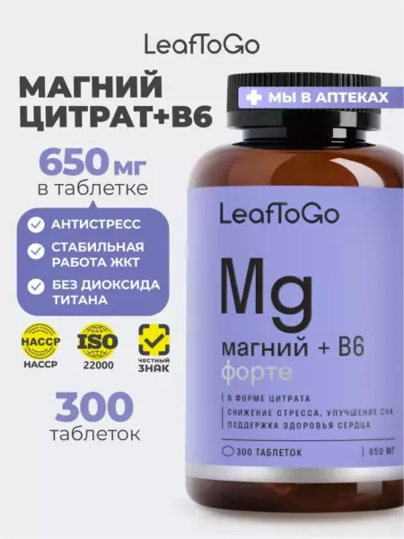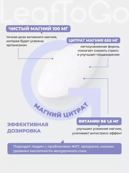 LeafToGo Магний+B6 - это уникальный продукт, который помогает поддерживать здоровье и повышать энергию. Усиленная формула сочетает в себе высокую дозировку самой усваиваемой формы магния( магний цитрат) 650 мг и витамина B6 без лишних добавок. Магний и витамин В6 взаимодействуют в организме и усиливают друг друга. Витамин В6 помогает магнию лучше усваиваться и использоваться в организме. Магний является важным минеральным веществом, которое участвует во всех метаболических обменных процессах – углеводном, белковом и жировом, а также в проведении нервного возбуждения, способствует сокращению миокарда, повышает устойчивость к стрессу, обладает антиаритмическим действием. Магний принимает непосредственное участие в поддержании электролитного баланса. Необходим для поддержания здоровья мышечной, сердечно-сосудистой и нервной систем. Витамин В6 - один из важнейших витаминов группы В, который положительно воздействует на нервную систему, повышает работоспособность, стимулирует мозговую активность и физическую выносливость. Способствует ускорению роста мышечных тканей, так как является необходимым элементом метаболизма белков. Мышцы становятся более сильными и медленнее утомляются. Данная формула способствует: - повышению устойчивости организма к стрессу; - уменьшению раздражительности; - поддержке нервной системы; - поддержке cердечно-сосудистой системы; - поддержке мышц, снятию мышечных спазмов и судорог; - максимально восполняет дефицит магния при высоких физических и психоэмоциональных нагрузках; - отличается высокой степенью усвоения; - удобный прием – по 2 таблетки комфортного размера без препятствий для глотания; - хорошо усваивается без побочных эффектов со стороны ЖКТ;