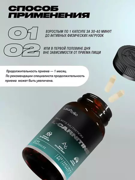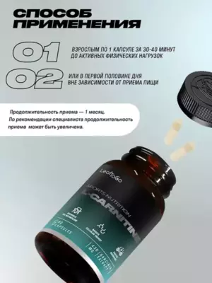 L карнитин представляет собой источник этого вещества в капсулах, который предназначен для спортсменов и всех, кто заботится о своем здоровье и внешности. L-карнитин - это вещество, родственное витаминам группы В, которое выполняет транспортную функцию, перенося жиры из запасов в митохондрии мышц, где они используются в качестве источника энергии. Поэтому l carnitine способствует использованию жировых запасов в качестве источника энергии во время аэробной тренировки, снижает уровень вредного холестерина в крови и уменьшает нагрузку на сердце и сосуды во время активности с повышенным пульсом. l-carnitine поможет улучшить качество тела, снизить вес и уровень вредного холестерина в крови. Этот жиросжигатель и таблетки для похудения работают отлично в сочетании с любой физической нагрузкой, помогая эффективнее сжигать лишний жир и достигать желаемых результатов. Вы можете быть уверены, что наш продукт является высококачественным спортивным питанием, которое поможет вам достичь своих целей в фитнесе и здоровом образе жизни. Кроме того, благодаря своим полезным свойствам, наш продукт может быть использован в качестве дополнительной косметики для поддержания красоты и здоровья. Если вы ищете средство для похудения для женщин и мужчин или просто хотите улучшить свое тело и здоровье, то л карнитин от LeafToGo может быть отличным выбором. Мы рекомендуем его для использования в сочетании с физической нагрузкой и здоровым питанием для достижения максимального эффекта. Наш продукт может быть полезен для людей, которые заботятся о своем сердечно-сосудистом здоровье, поскольку карнитин способствует улучшению работы сердца и сосудов.