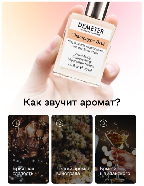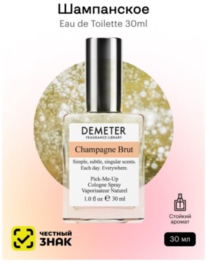 Нельзя не согласиться с Лёликом из «Бриллиантовой руки»: аромат «Champagne Brut» совершенно вечерний, пить его с утра нет никакой необхо димости, но носить его на себе — обязанность любого аристократа. Выбрав «Champagne Brut» от Demeter, мы просим не беспокоиться дом Периньон, Моэт и Шандон, и, особенно, вдову Клико.