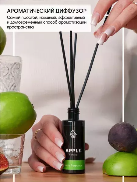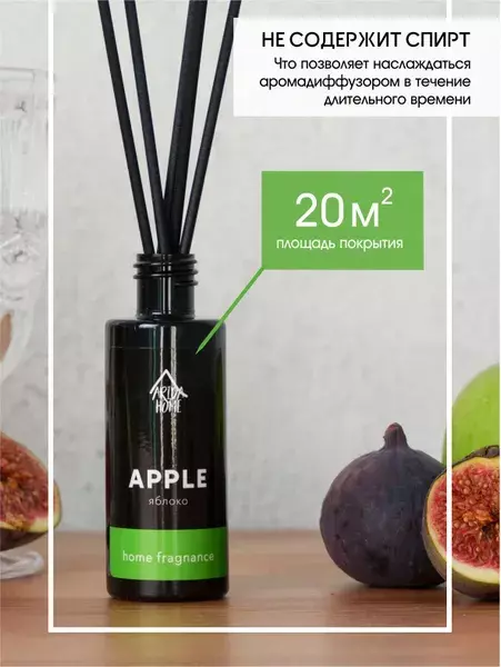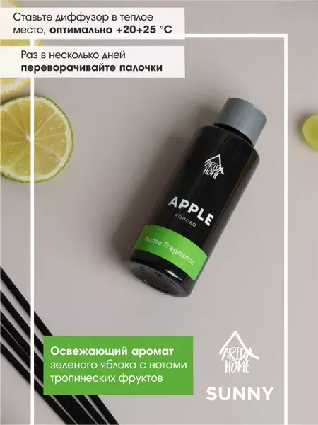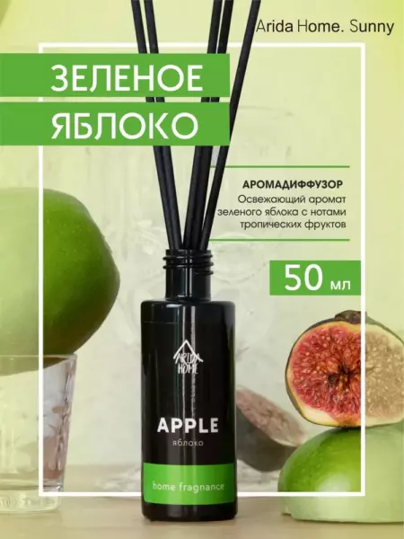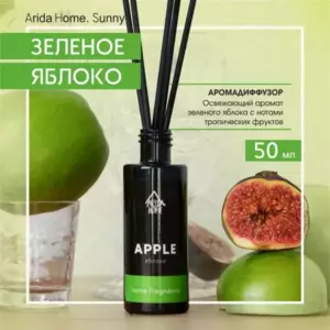 Аромадиффузор Arida Home Sunny Яблоко 50 млДиффузор с фибровыми палочками - это безопасный экологически чистый и натуральный способ ароматизации помещения, является прекрасной альтернативой ароматизированным спреям. Стильный дизайн этого модного ароматического аксессуара украсит любой интерьер. Диффузор представляет собою изящную пластиковую бутылочку с ароматической жидкостью. В неё вставляются несколько длинных фибровых палочек (5 шт.). Постепенно, насыщаясь эфирными маслами, они распространяют аромат по всей комнате. Палочки важно применять сразу все и периодически переворачивать (1-2 раза в сутки).Флакона, объёмом 50 мл, хватит на помещение площадью до 15 кв.м.Срок службы диффузора до 4 недель, в зависимости от места использование. В более влажных помещениях срок использования сокращается.