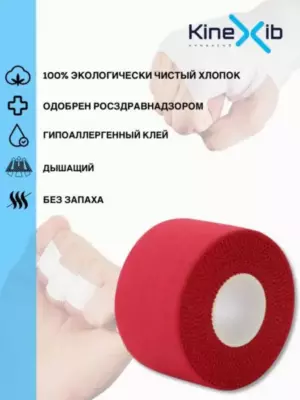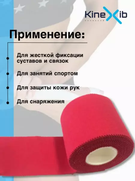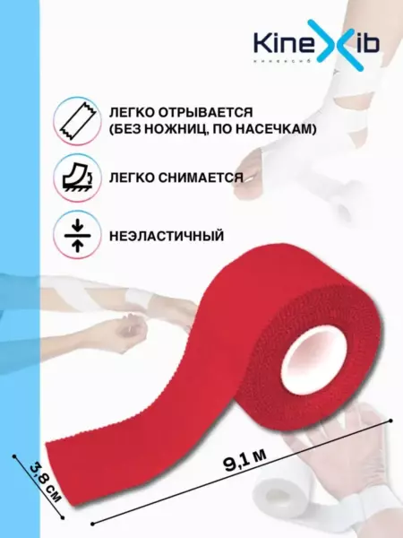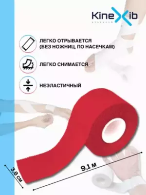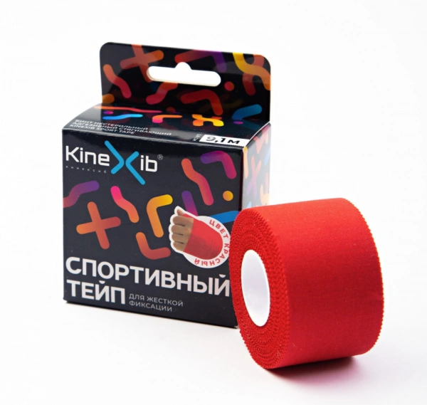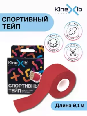 Спортивный тейп Kinexib представляет собой ленту из плотного хлопка с гипоаллергенным клеем на акриловой основе, не эластичен. Применяется для жесткой фиксации суставов, связок, а также для обмотки элементов снаряжения. Обеспечивает компрессию на длительное время. Отрывается без ножниц, быстро приклеивается и легко снимается. Успешно заменяет бандаж.