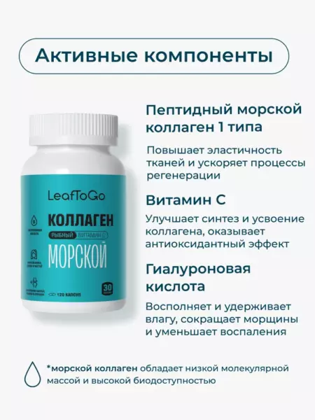LeafToGo collagen - это натуральный продукт, созданный из высококачественного коллагена c витамином C. Попадая в организм, этот белок расщепляется на набор аминокислот и помогает коже дольше оставаться молодой и здоровой. А также поддерживает в отличном состоянии суставы, мышцы, скелет, хрящевую ткань, в несколько раз сокращается ломкость волос и ногтей. Гиалуроновая кислота - это «универсальная молекула красоты», важна для поддержания водного баланса клеток организма. Принимать коллаген нужно вместе с витамином C, который уже идет в составе. Поэтому никакие другие добавки вам не нужны.