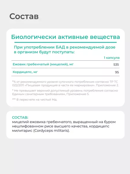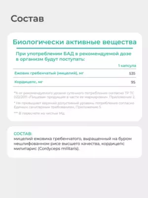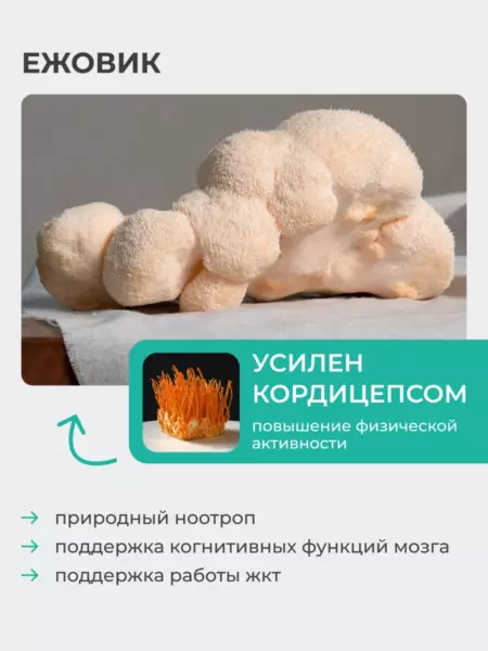 Продукт содержит гриб ежовик гребенчатый мицелий, также известный как Lion’s Mane ежовик, стимулирует рост нейронов, поддерживает ясность ума и эмоциональное равновесие. Благодаря этому он часто рассматривается как натуральные антидепрессанты от депрессии и эффективное успокоительное средство растительного происхождения. В одной капсуле содержится комплекс витаминов, способствующий улучшению когнитивных функций, восстановлению нервной системы, укреплению иммунитета и оздоровлению кишечника.