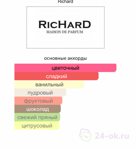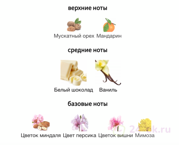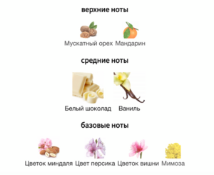 - Ноты Мускатный орех, Мандарин, Персиковый цвет, Мимоза, Вишня, Белый шоколад, Миндаль, Ваниль
