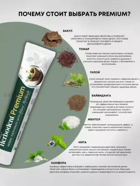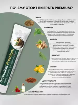 Зубная паста Премиум высшего качества на растительной основе с антибактериальным и иммунизирующим действием – это лечебно-профилактическое средство ухода за зубами, деснами и всей полостью рта. Паста прекрасно очищает эмаль зубов, не царапая и не повреждая ее, поскольку не содержит грубых абразивов, благодаря экстрактам лекарственных трав уплотняет рыхлые десны, снимает воспалительные процессы, которые часты при заболеваниях полости рта. Она содержит особые формы целебных экстрактов, которые легко проникают сквозь слизистые оболочки и оказывают лечебное действие значительно эффективнее любых натуральных зубных порошков.