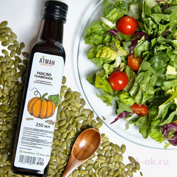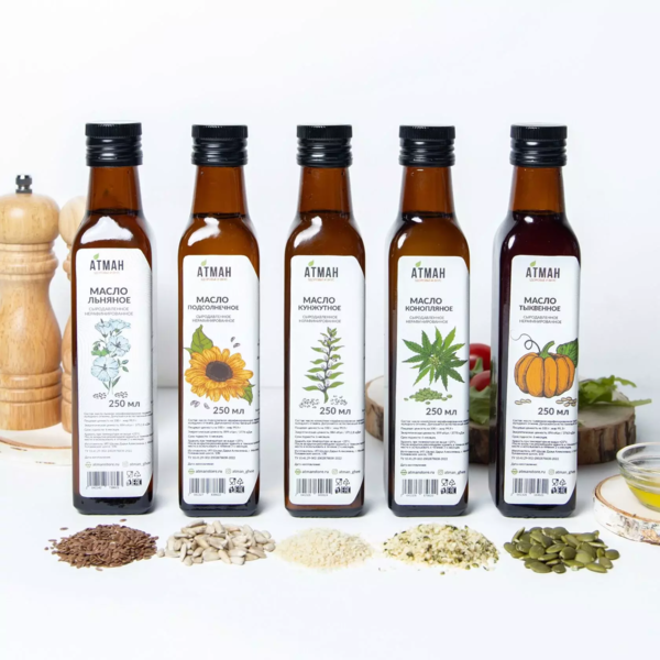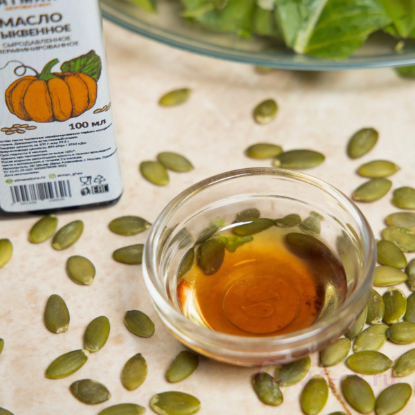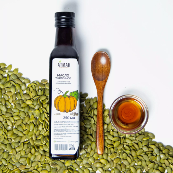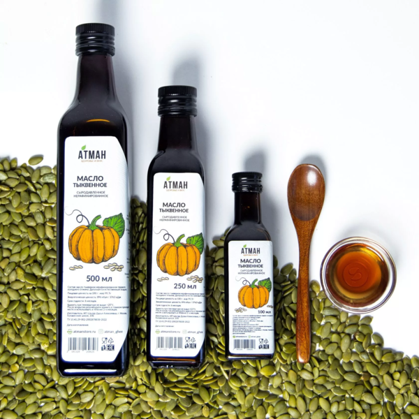 Сыродавленное тыквенное масло от АТМАН — живой источник растительного жира, созданный путем бережного холодного отжима фермерских семян тыквы.