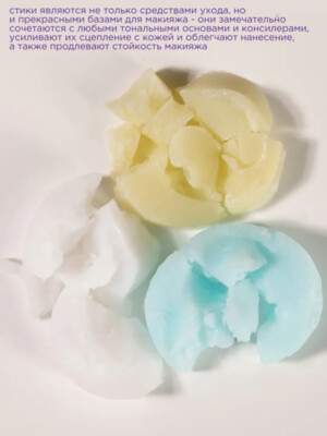 Данные стики являются не только средствами ухода, но и прекрасными базами для макияжа - они замечательно сочетаются с любыми тональными основами и консилерами, усиливают их сцепление с кожей и облегчают нанесение, а также продлевают стойкость макияжа.