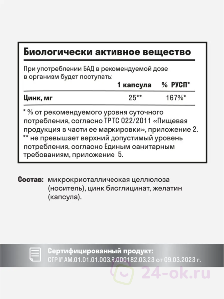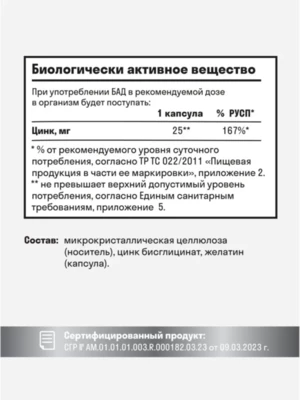 Масса капсулы 350 мг. Микрокристаллическая целлюлоза (носитель), цинк бисглицинат, желатин (капсула)