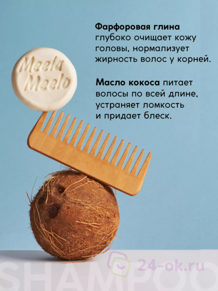Фарфоровая глина глубоко очищает кожу головы, нормализует жирность волос у корней. Масло кокоса питает волосы по всей длине, устраняет ломкость и придает блеск.