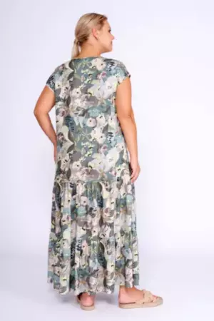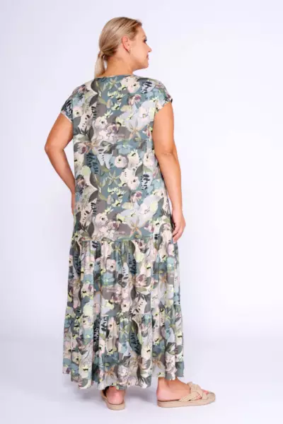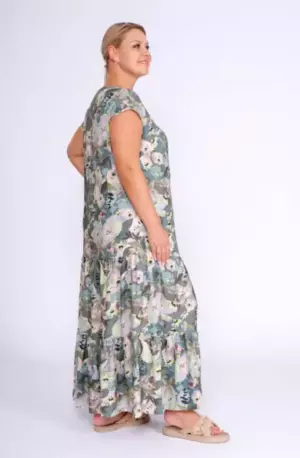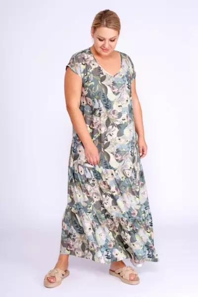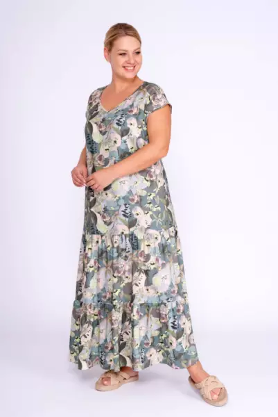 Платье А-силуэта со сборками по низу. V-образный вырез горловины. Спущенное плечо. Макси платье, с флоральным принтом в пастельной гамме, идеально дополнит летний гардероб в сочетании с базовыми аксессуарами и обувью.