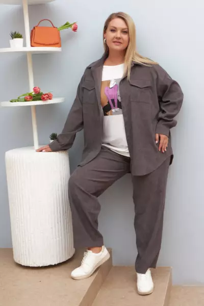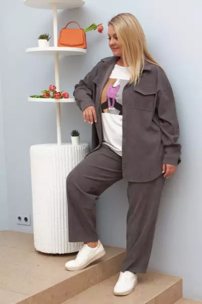 Вельветовые зауженные брюки. Застёжка - гульфик на молнии, пуговица. Задняя половинка пояса с эластичной тесьмой. Карманы в боковом шве и накладные сзади. Дополните рубашкой из этой же капсулы.