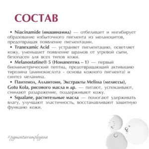 Комплекс инновационных активов молекулярной косметологии абсолютно безопасно и эффективно отбеливает кожу, устраняет гиперпигментацию, борется с фотостарением кожи, стимулирует антиоксидантную защиту кожи, усиливая ее защиту от ультрафиолетового излучения.