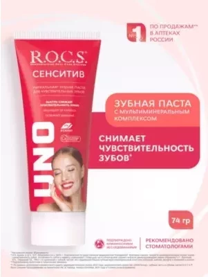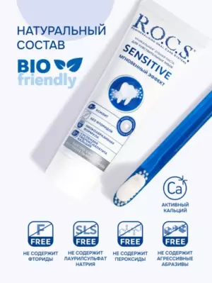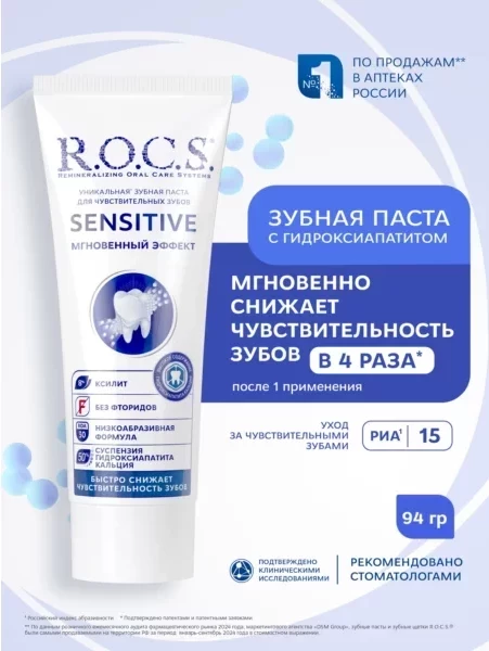Зубная паста для чувствительных зубов R.O.C.S.® SENSITIVE Мгновенный Эффект Быстро устраняет повышенную чувствительность зубов. Обладает очень низкой абразивностью (показатель RDA =40, что ниже, чем у регулярных паст для ежедневной гигиены). Не травмирует дентин и эмаль зуба. Эффективно защищает от кариеса. Возвращает зубам блеск. Нормализует состав микрофлоры полости рта. Освежает дыхание.