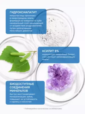 1. Минеральное восстановление собственных структур зуба за счет высокой биодоступности кальция глицерофосфата, источника ионных форм кальция и фосфата.