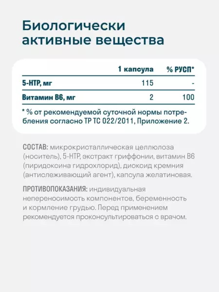 Не является лекарственным средством. микрокристаллическая целлюлоза (носитель), 5-гидрокситриптофан, Экстракт грифонии, желатин (капсула), Витамин B6, Диоксид кремния
