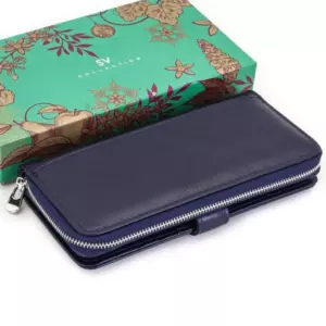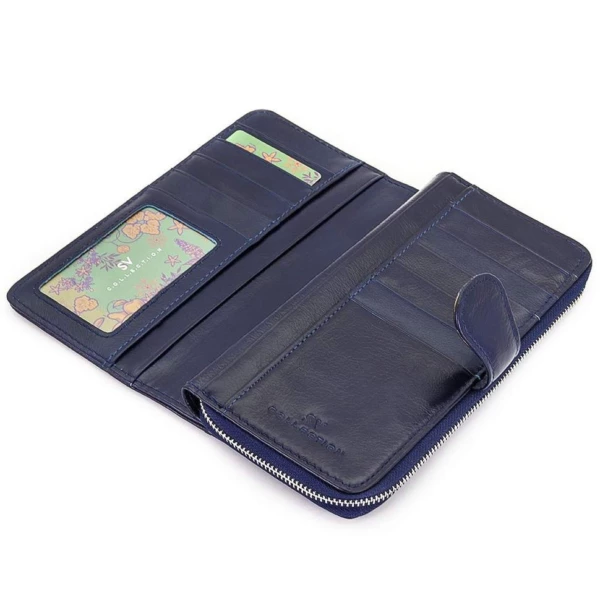 Женский кожаный кошелек от SV. Первое отделение закрывается хлястиком с кнопкой. Внутри - пять карманов для купюр, десять кармашков для пластиковых карт и прозрачное окошко для фотографии. Второе отделение на молнии, предназначено для монет и мелких предметов.