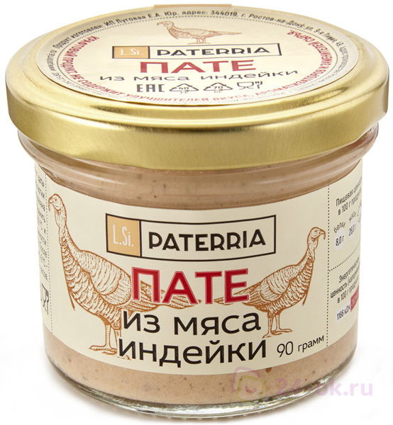 Состав: мясо индейки, масло сливочное, яйцо куриное, пастернак, вино, вода, лук, соль, чеснок, тимьян, перец черный, перец душистый, перец сычуаньский, фенхель