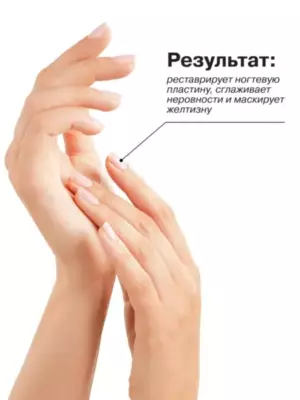 Ультравосстановление для неровных ногтей. Эффективно маскирует желтизну ногтевой пластины, способствует предотвращению обесцвечивания, визуально сглаживает неровности, подобно ВВ-крему. Придает ногтям здоровый и ухоженный вид.