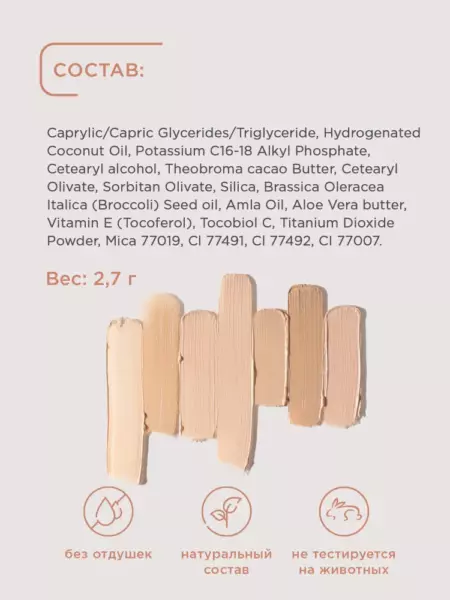 INCI: Caprylic/Capric Glycerides/Triglyceride, Hydrogenated Coconut Oil, Potassium C16-18 Alkyl Phosphate, Cetearyl alcohol, Theobroma cacao Butter, Cetearyl Olivate, Sorbitan Olivate, Silica, Brassica Oleracea Italica (Broccoli) Seed oil, Amla Oil, Aloe Vera butter, Vitamin Е (Tocoferol), Tocobiol C, Titanium Dioxide Powder, Mica 77019, Cl 77491, Cl 77492, CI 77007.